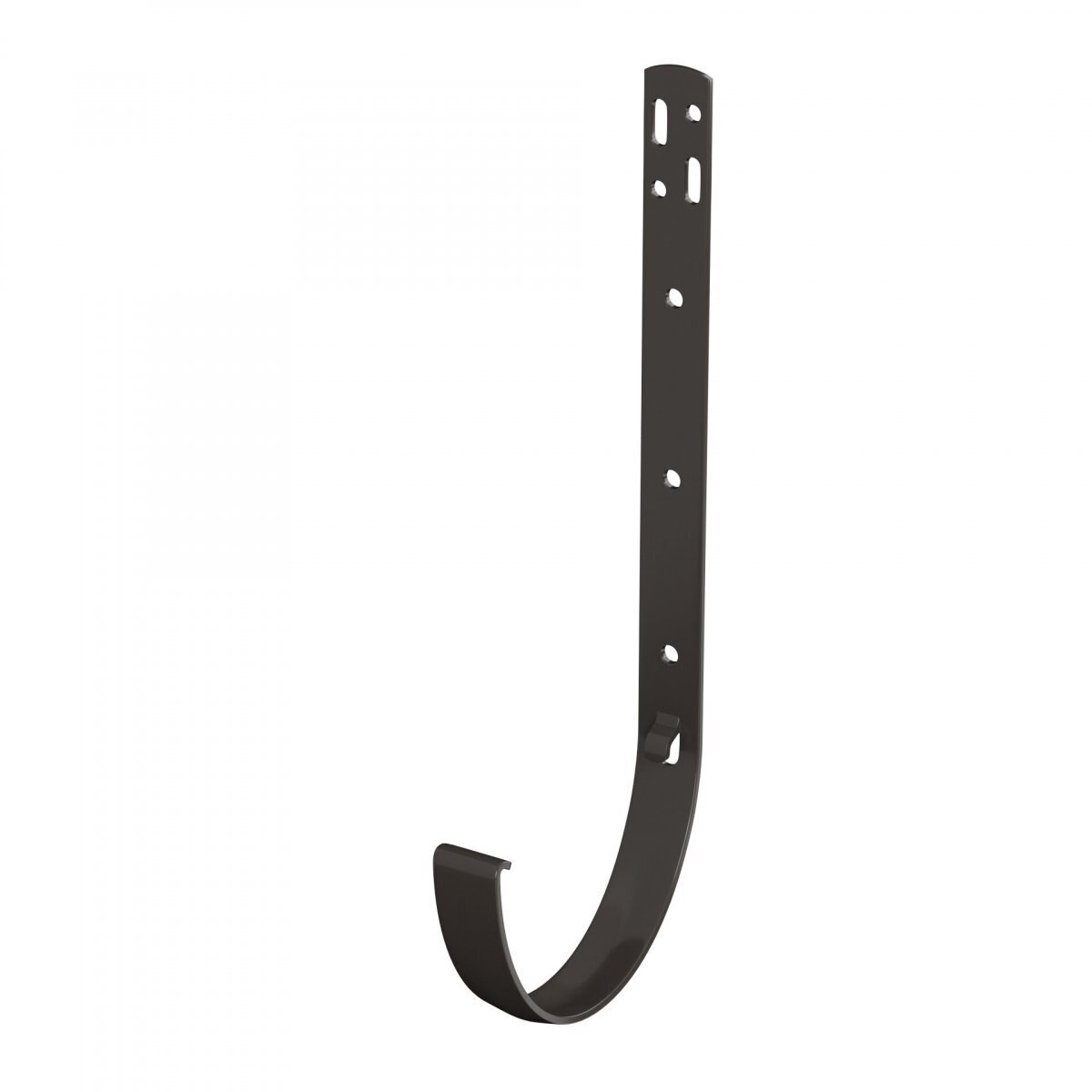 Крюк крепления желоба - металлический элемент пластиковой водосточной системы ТЕХНОНИКОЛЬ. Выполнен из оцинкованной стали с цветным полимерным покрытием. Предназначен для крепления желоба к лобовой доске с учетом заданного уклона.